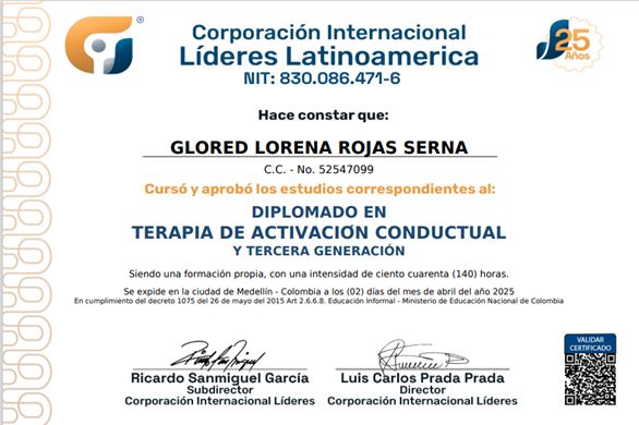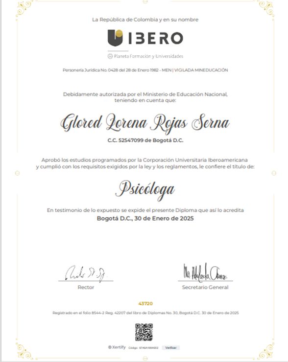 Soy Glored Lorena Rojas, mujer, madre, esposa y profesional, Psicóloga integral, con experiencia en acompañamiento psicológico en gestión, dependencia e inteligencia emocional, autoestima y crecimiento personal, identificación y manejo de violencia invisibilizada.
